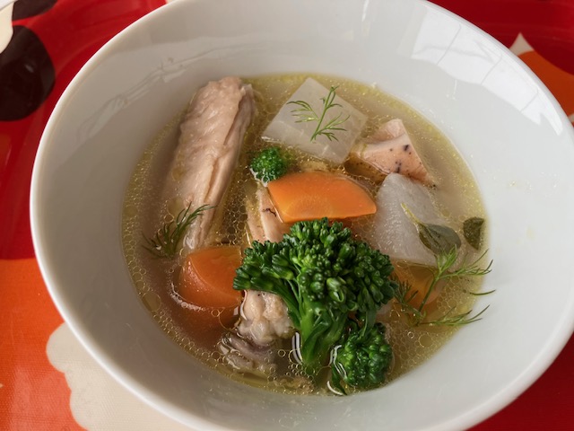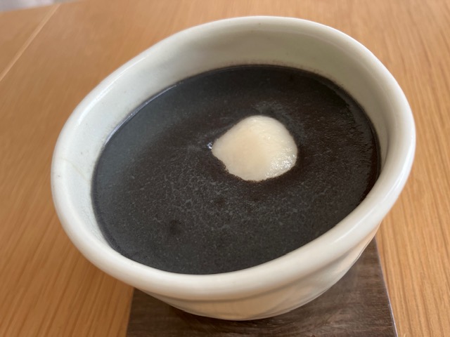 今月は黒コショウパンです。 毎日寒い日が続いていますが、もうすぐ春の土用です。 スープは冬野菜がメインになっていますが、春の食材として緑の野菜も入れてあります。 デザートは黒ゴマのお汁粉です。本場の香港では白玉などは入っていませんが、 |